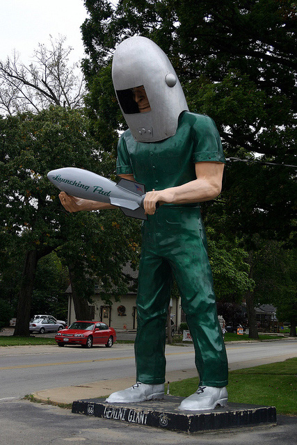 Travelers along Route 66 through Illinois may catch the site of a 1960’s Muffler Man, converted into a Gemini astronaut complete with space helmet and holding a large rocket.